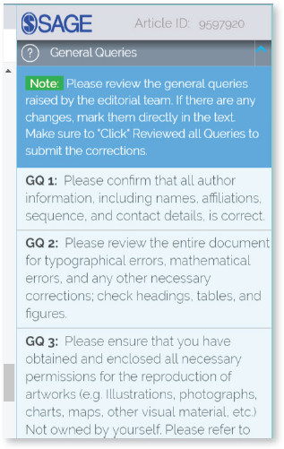 This panel will display a list of general queries raised by the Editorial team. Please note that all these queries are about general article information and you may respond to these queries either by making a change in the text or by adding a comment using the comment box. Please ensure all queries are responded to, without which the submission of your proof corrections cannot be completed.