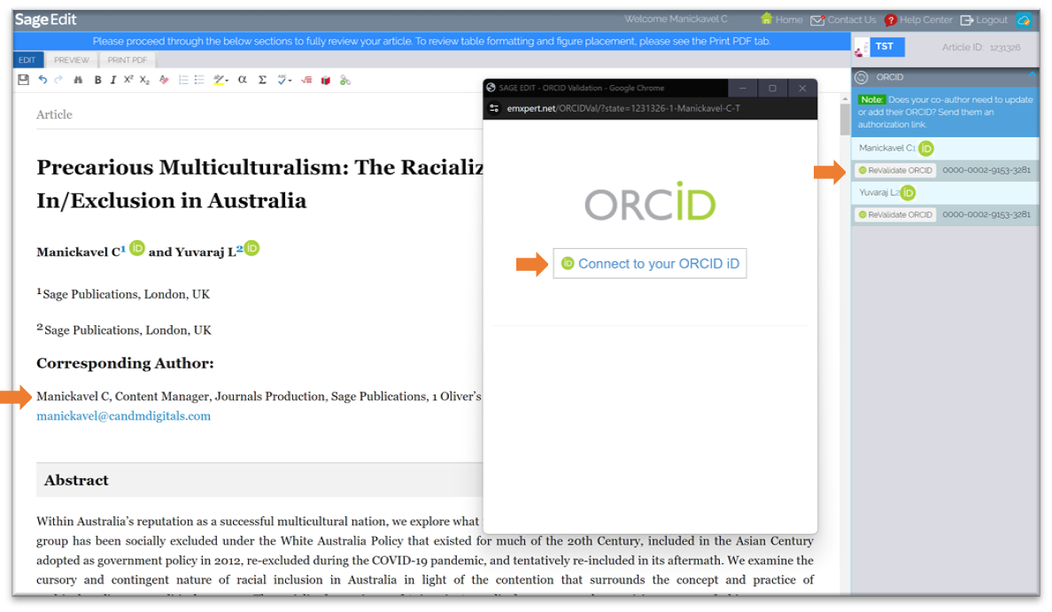 NOTE: The corresponding author can only validate their own ORCID IDs, for all the co-authors they can only send an email for validation. - The co-authors can simply click the hyperlink, and it will automatically pop up the ORCID portal, wherein the co-authors will be asked to validate/add the ORCID ID using their credentials. Once done, the information will be automatically updated in SAGE Edit.