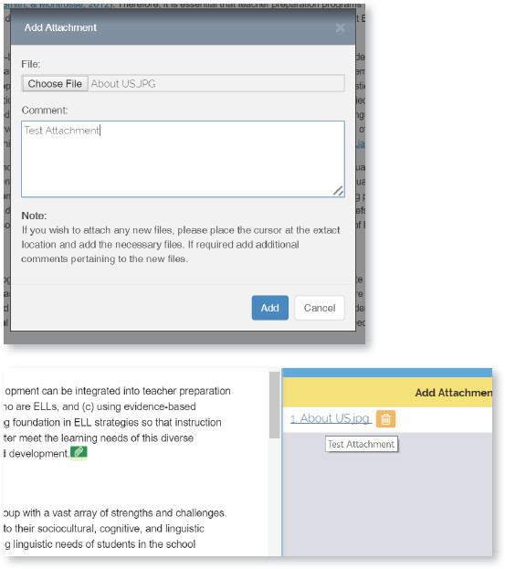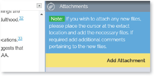 You can send new artwork, table, or references for incorporation in the article by uploading an attachment. Place the cursor anywhere within the body of the article, click on “Attachments” a pop-up window opens where you can attach the necessary files and add comments about them. Once done click “Add” and the file will be uploaded. A green attachment marker icon (