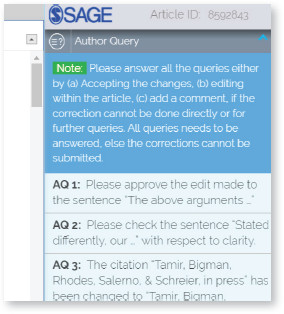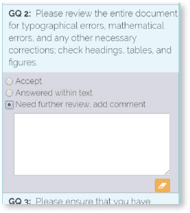 This panel displays specific queries about to the content of the article that need responses from you. Please attend to all queries carefully and ensure they are responded to, without which the submission of your proof corrections cannot be completed. There are three options—(1) Accept; (2) Answered within Text; (3) Need further review, add comment.