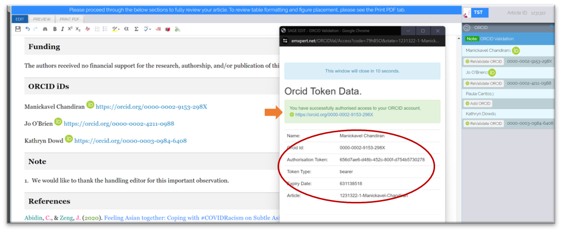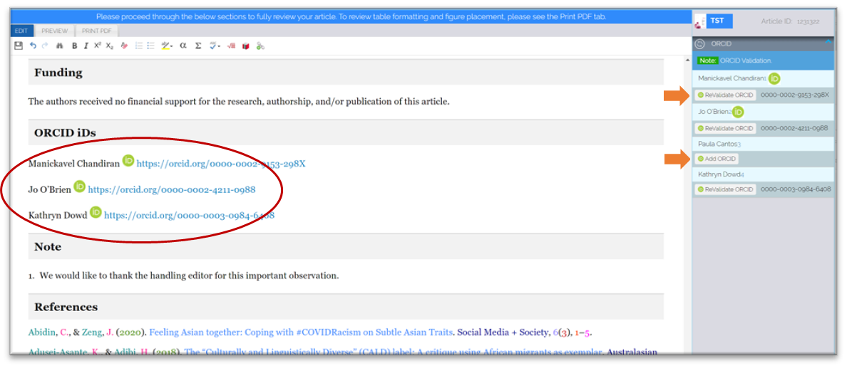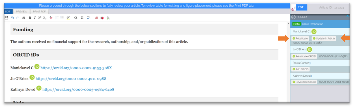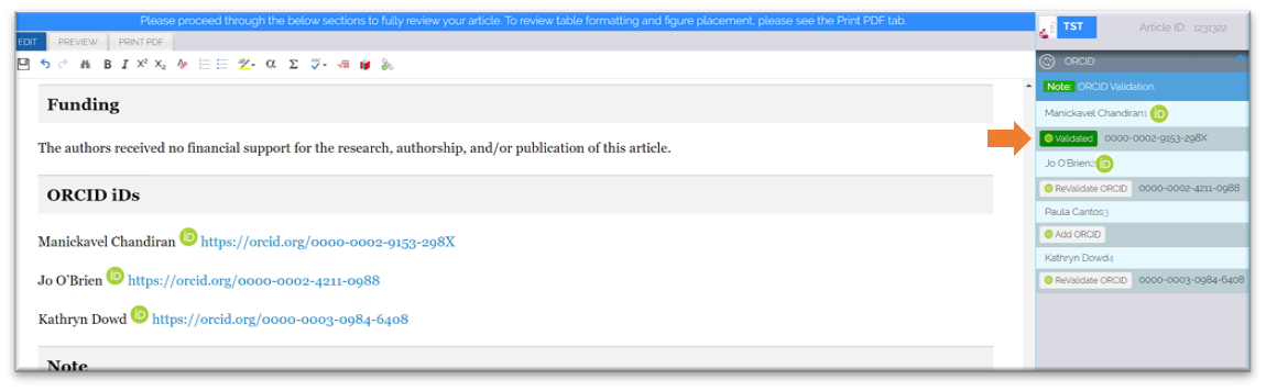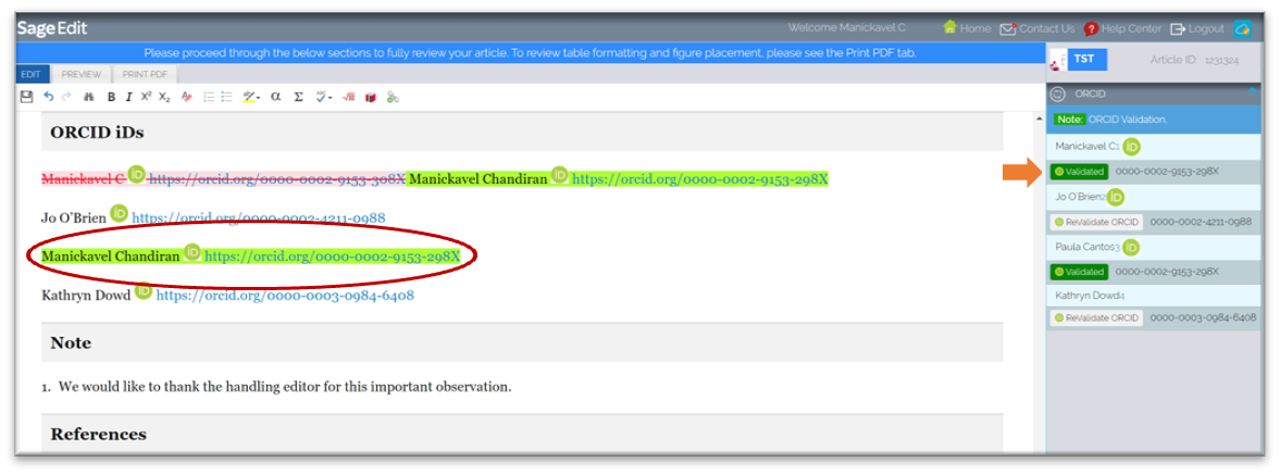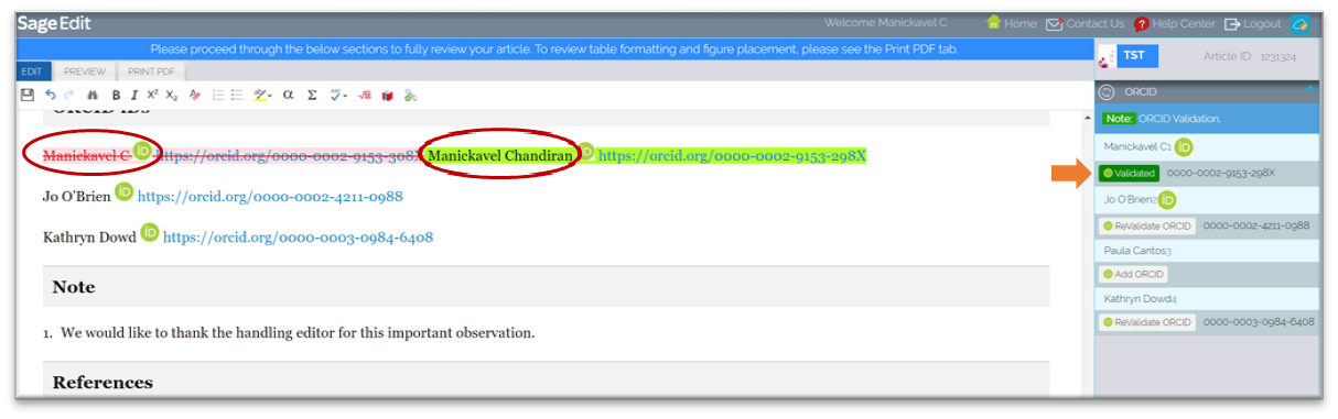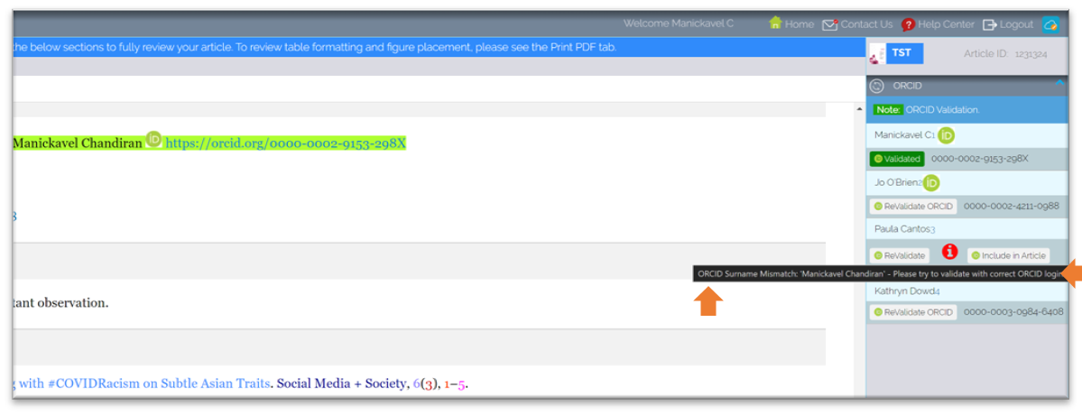 In such a situation, the user can either “ReValidate” again using the correct login. - Once done, make sure to click the “Include in Article” so that the correct ID is added to the proof with the exact name available in the ORCID database.