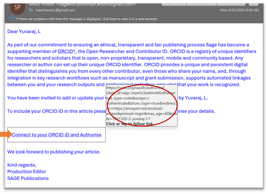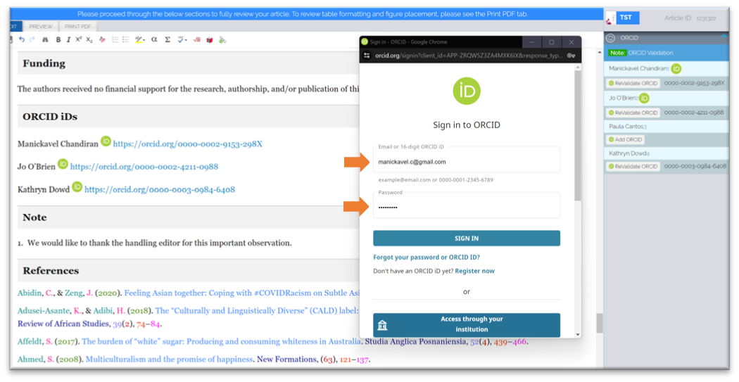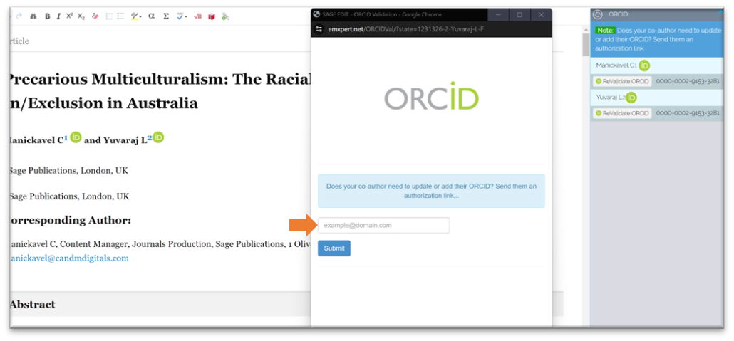 NOTE: The corresponding author can only validate their own ORCID IDs, for all the co-authors they can only send an email for validation. - The co-authors can simply click the hyperlink, and it will automatically pop up the ORCID portal, wherein the co-authors will be asked to validate/add the ORCID ID using their credentials. Once done, the information will be automatically updated in SAGE Edit.